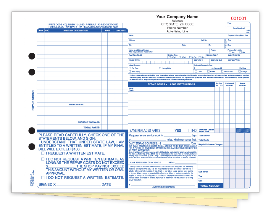 Automotive Repair Order Forms - 3-Part Carbonless - Custom Printed (Package of 250)