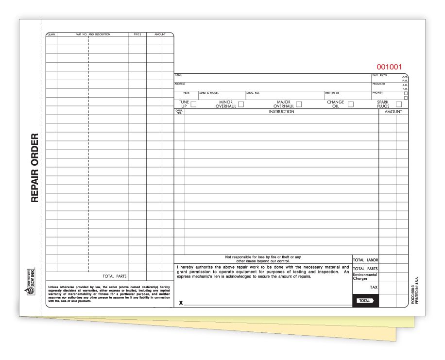 Automotive Repair Order Forms - 3-Part Carbonless - Stock (Package of 250)