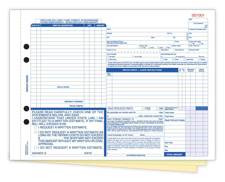 Automotive Repair Order Forms - 3-Part Carbonless - Stock (Package of 250)