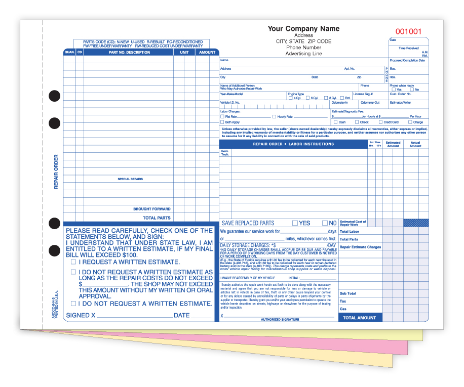 Automotive Repair Order Forms - 4-Part Carbonless - Custom Printed (Package of 250)