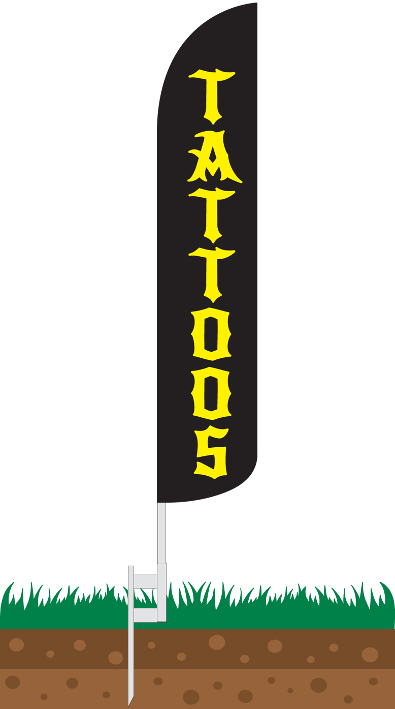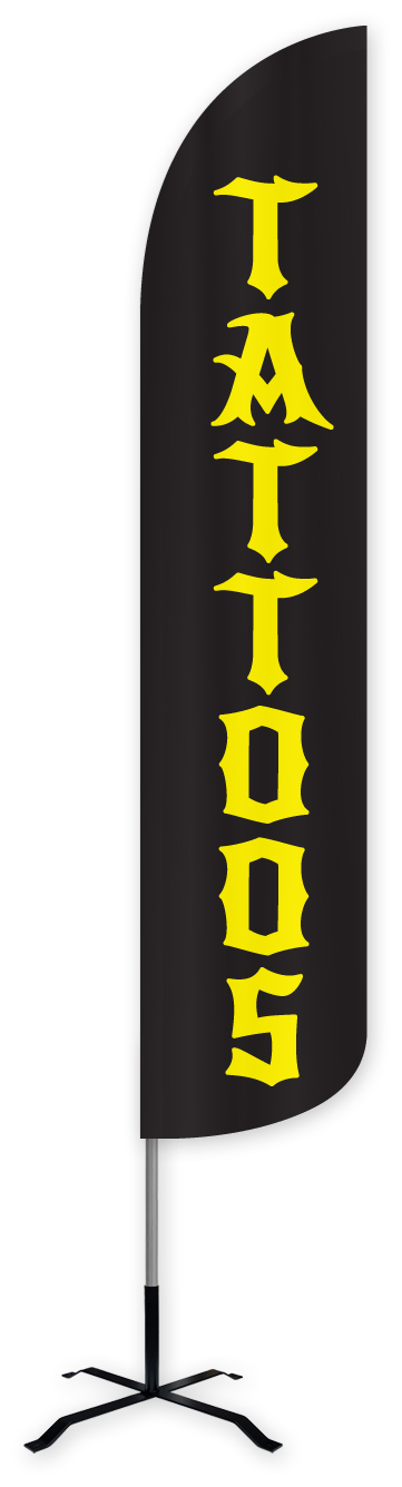 Our Tattoos Wind-Free Feather Flag Features a black background with yellow text running downwards that reads, "TATTOOS." This flag is a great choice for any tattoo shop looking to attract new customers.